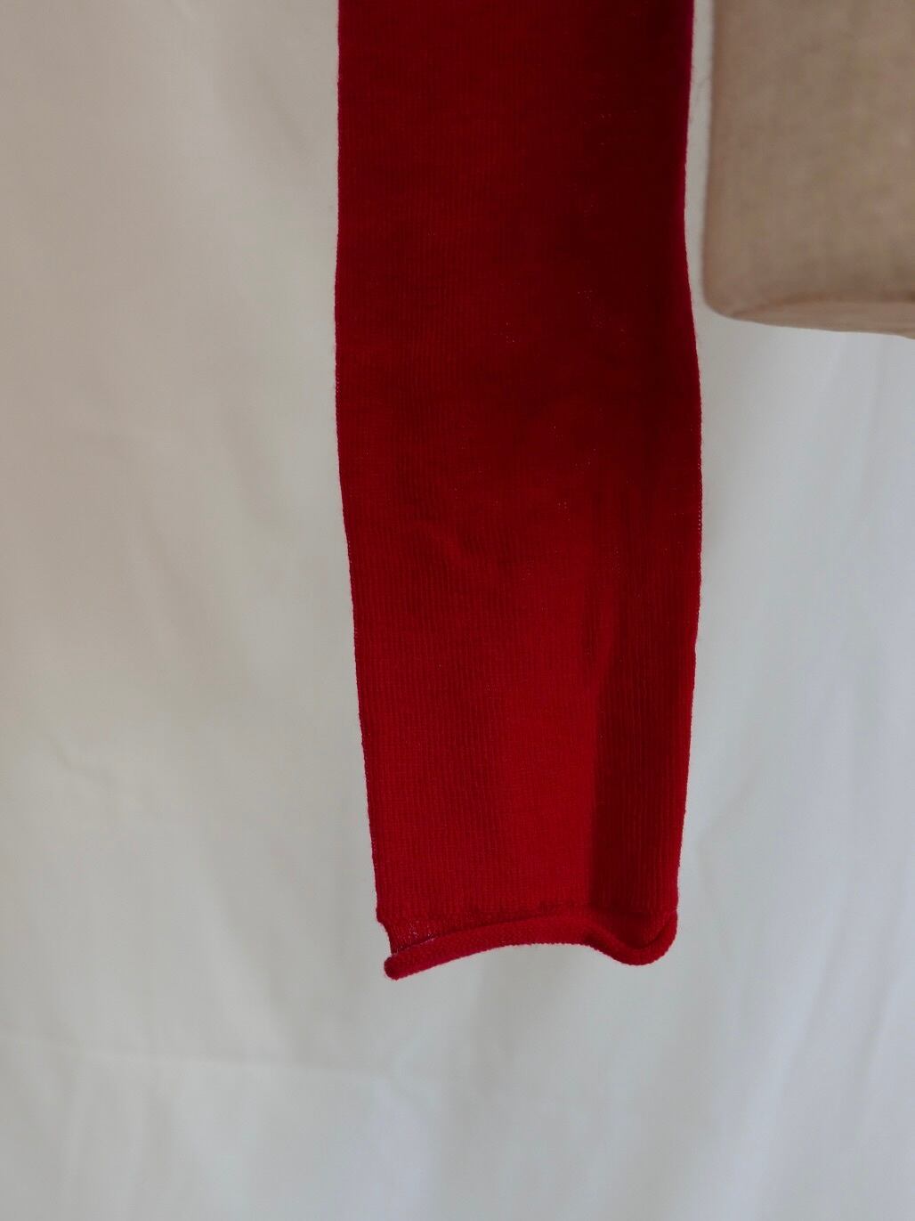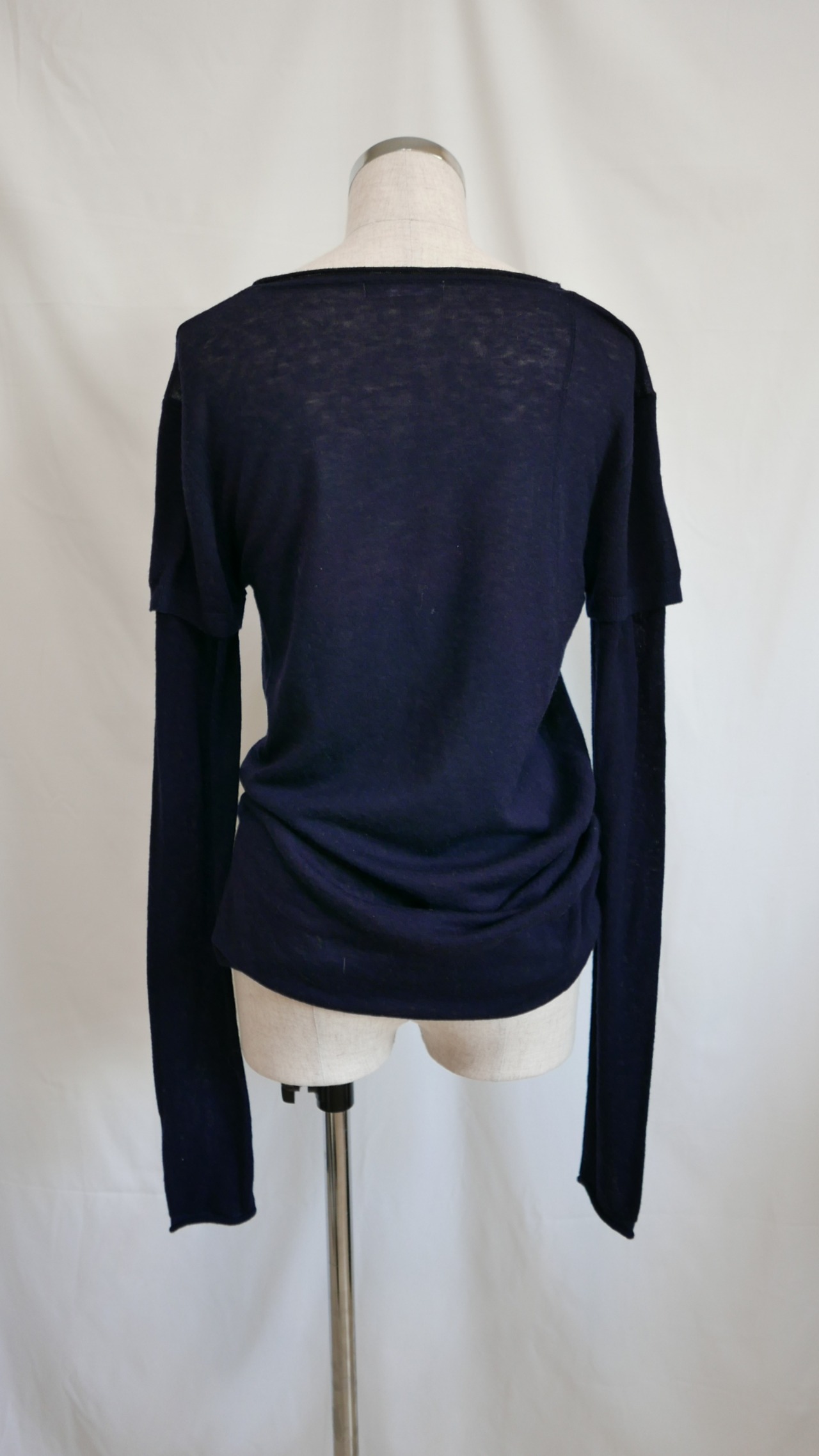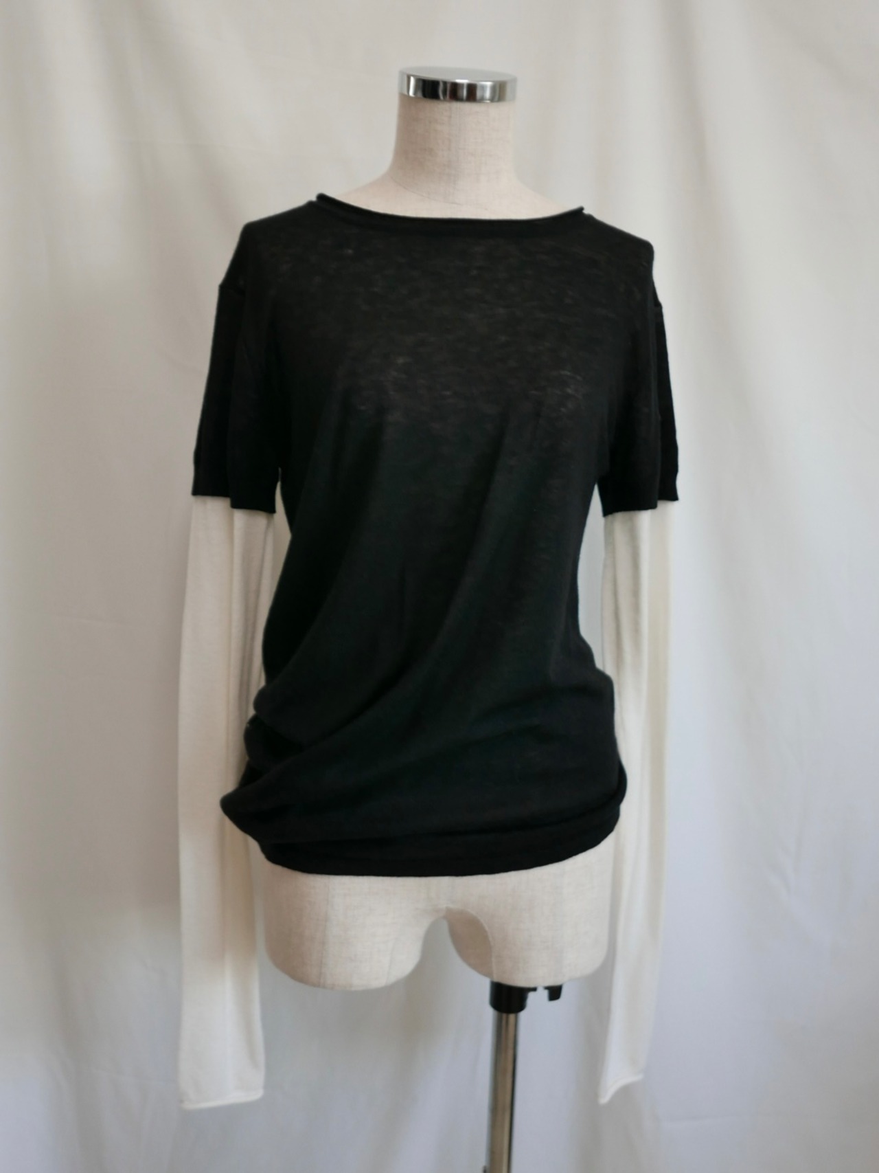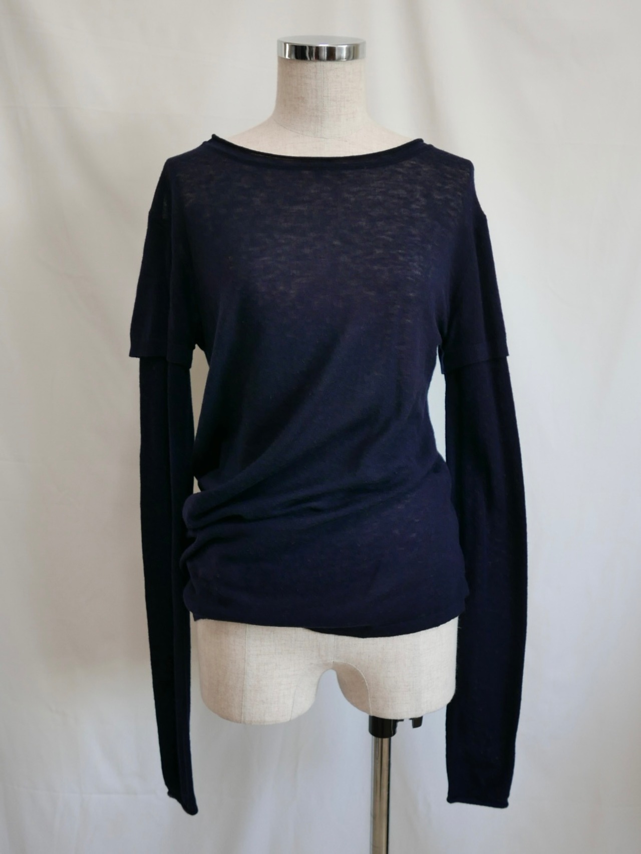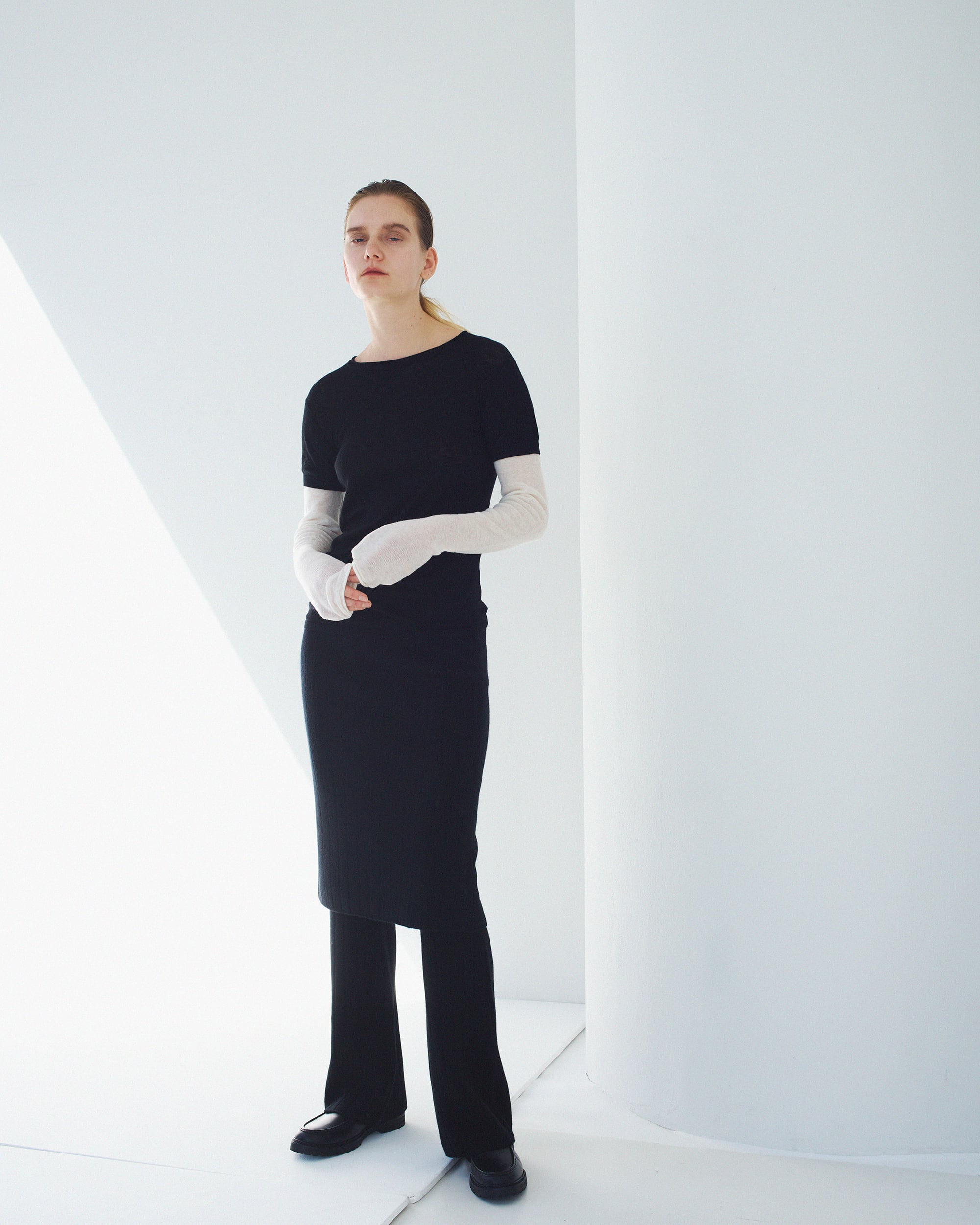 パターンを変形させて、着用時にドレープが生まれるように編み立てました。重ね着をしているようなデザイン。ふわりとした抜群の柔らかさでストレッチ性に優れた編み地に仕上がっています。フィットしすぎないシルエット。