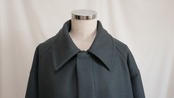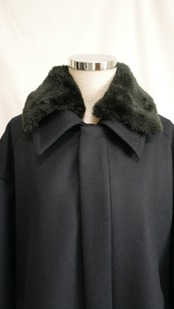 袖にはたっぷりと生地を使用したシルエットにしています。襟元は取り外し可能なファーの襟を、敢えてずれて見えるように付けました。取り外してスタンドカラーとしても着用できます。
