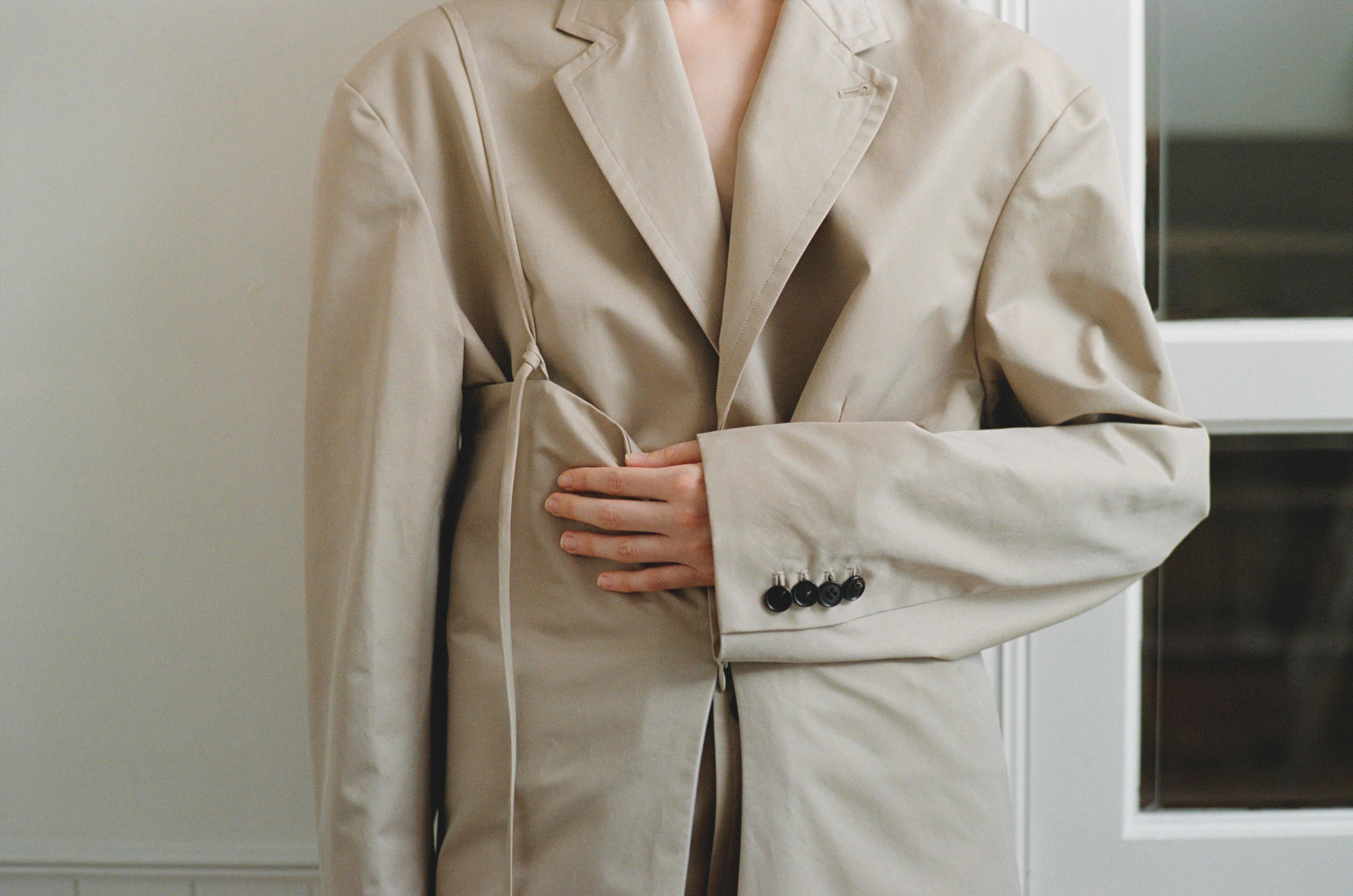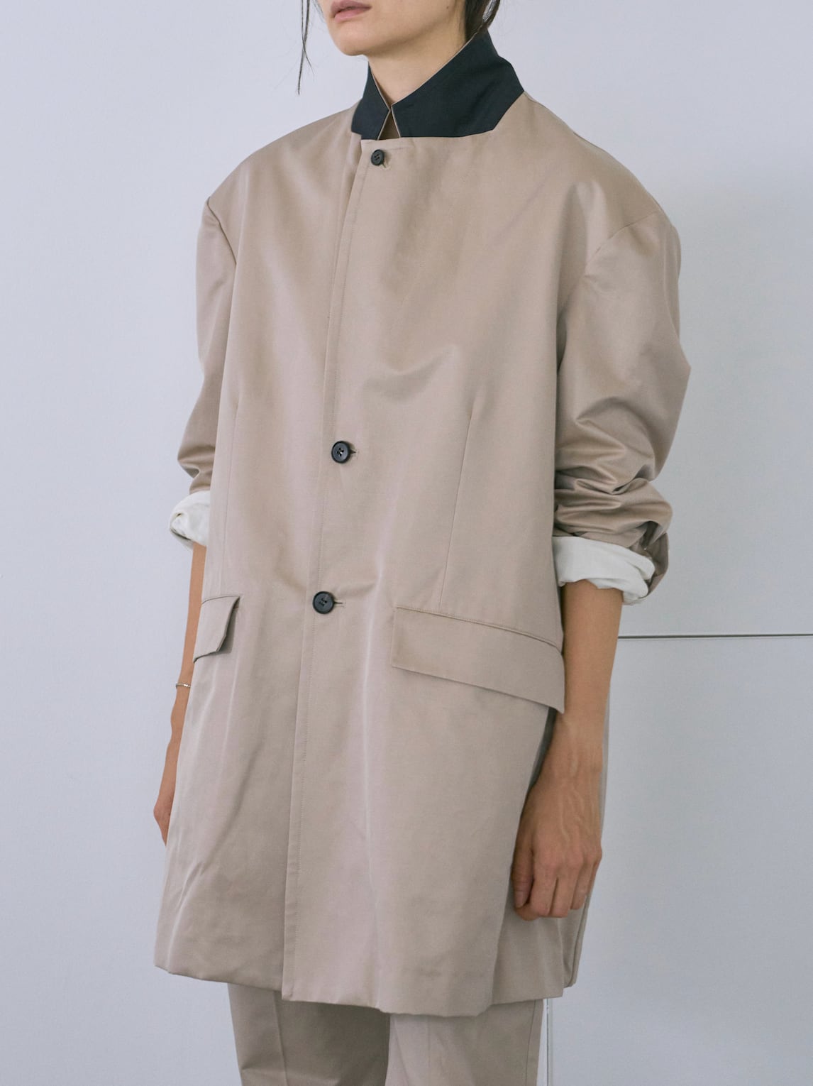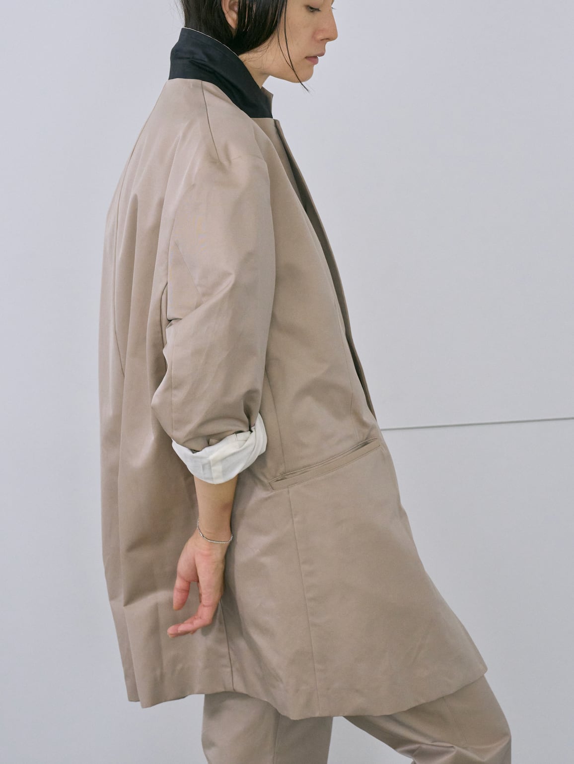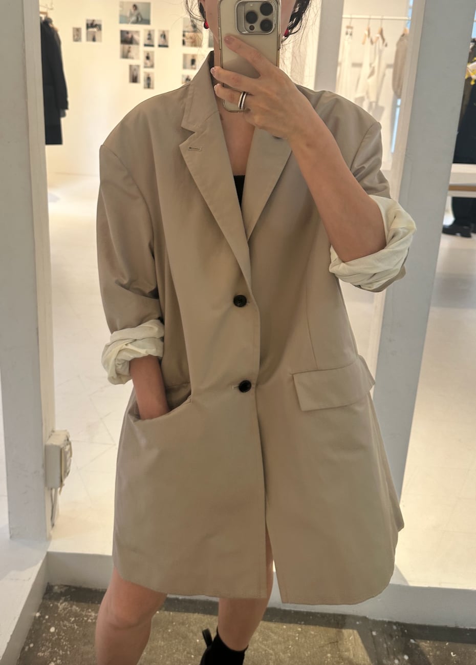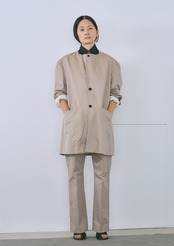 縦糸にポリエステル、緯糸にコットンの交織にて織り上げたツイル素材。ポリエステルとコットンを染め分けることで、先染めのようなシャンブレーの表情が生まれ、奥行きのある色合いが特徴。潔いオーバサイズ。襟を立てて着ることも可能。薄い肩パッドを内蔵しており、着用時に美しいシルエットが保たれます。撥水加工が施されており、実用性を兼ね備えています。