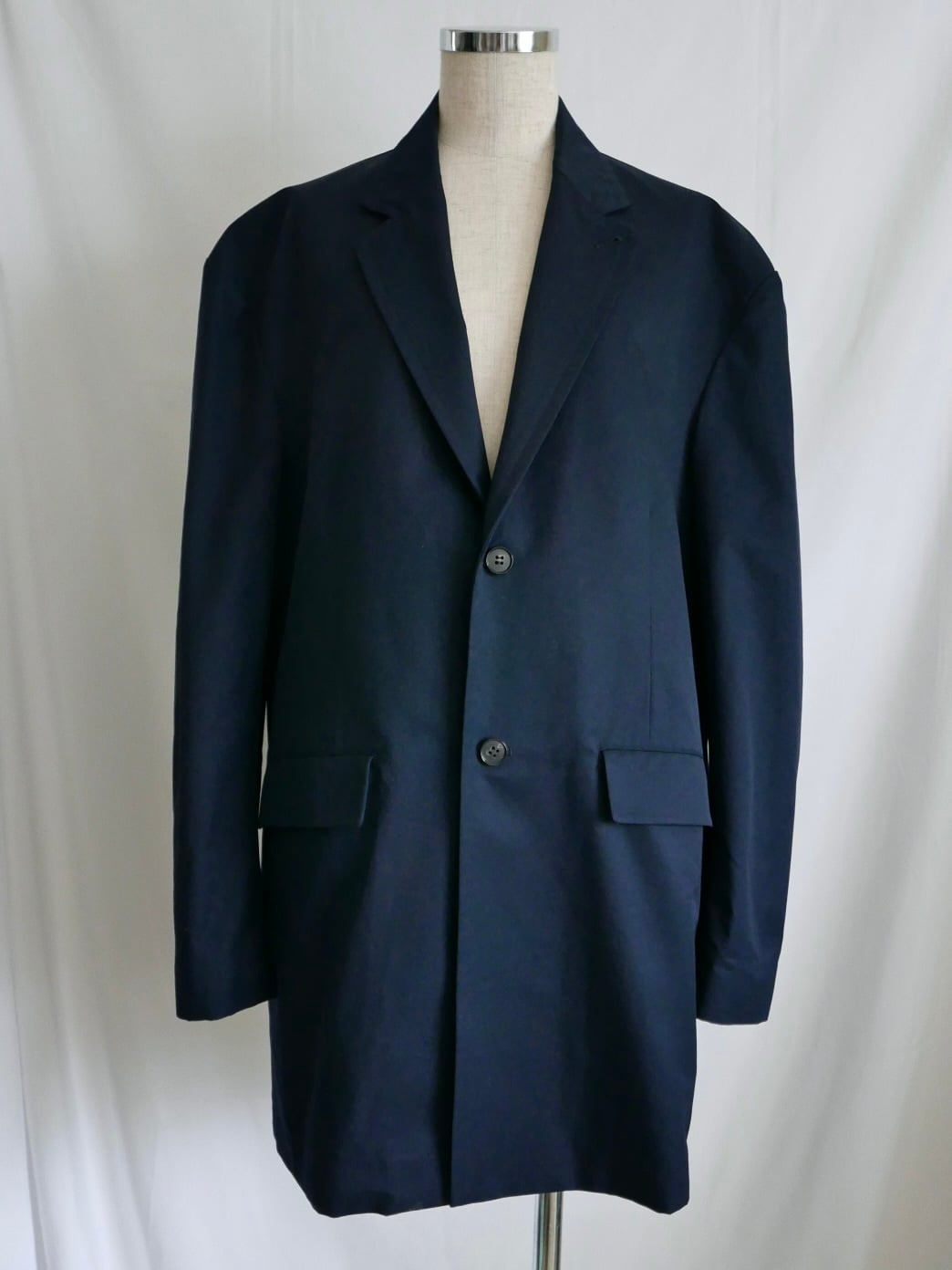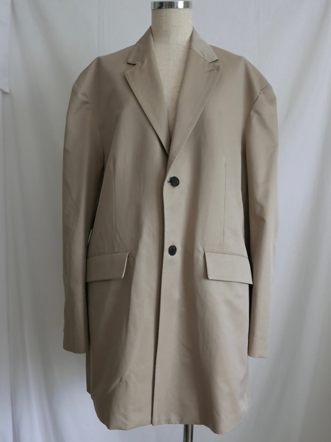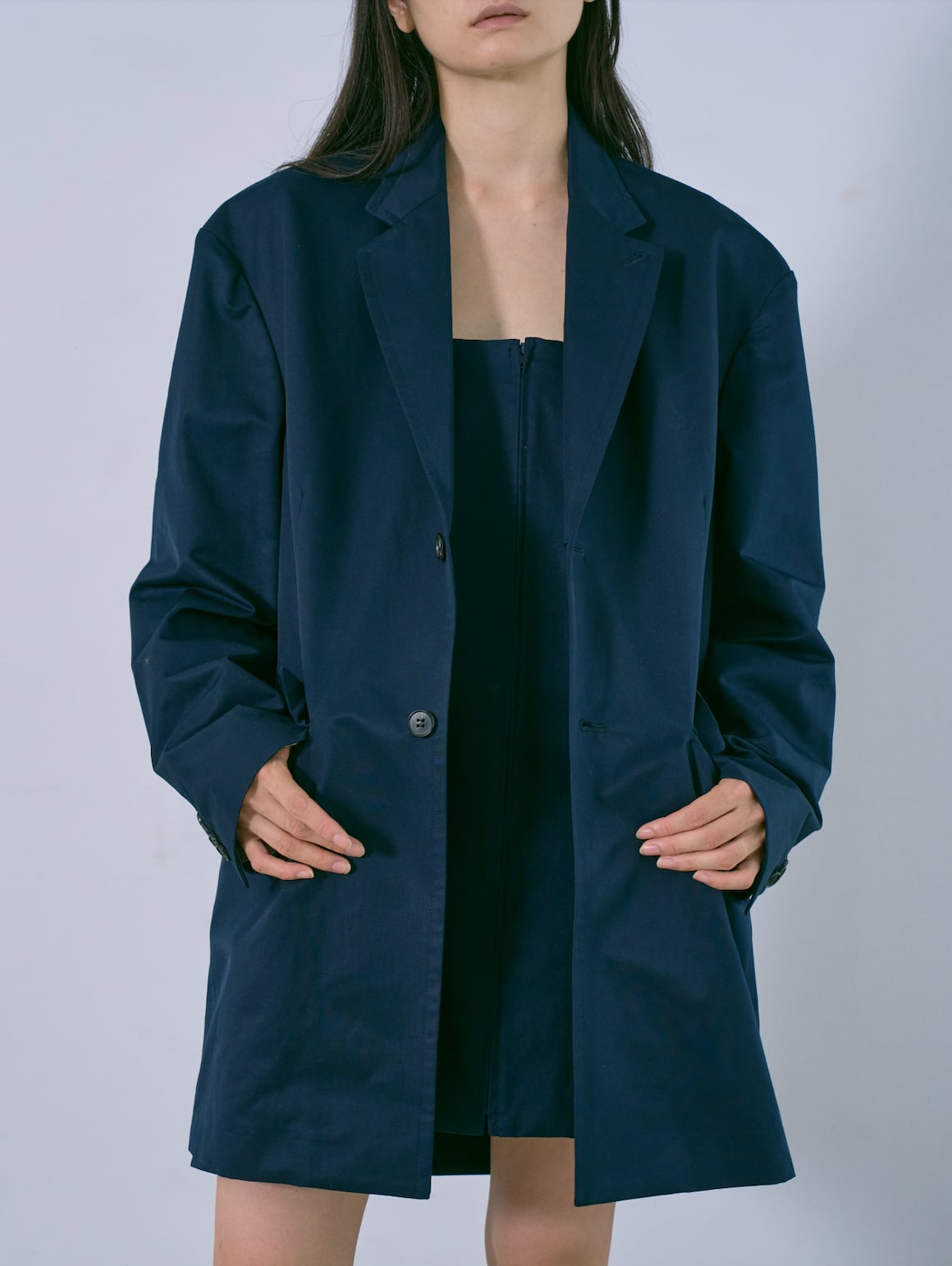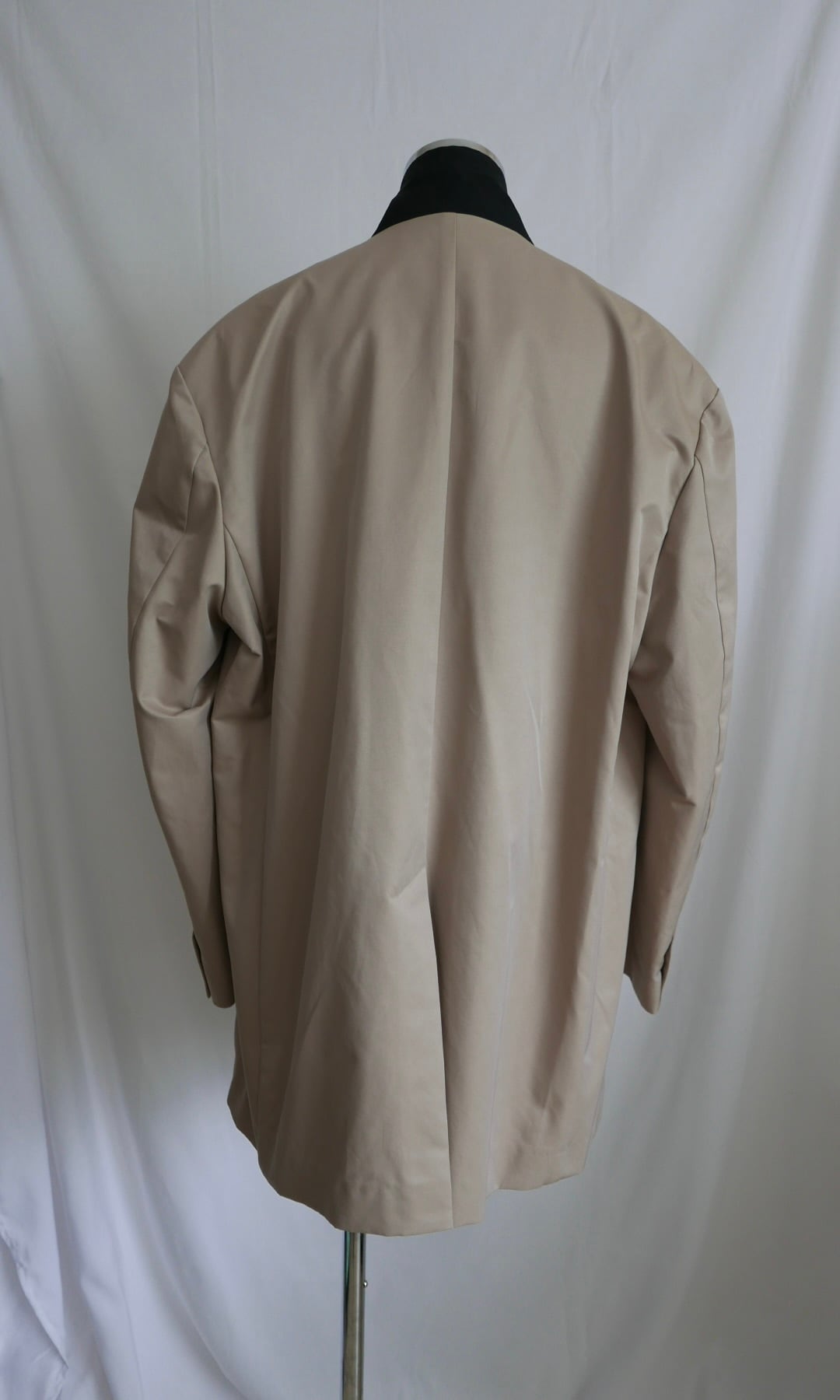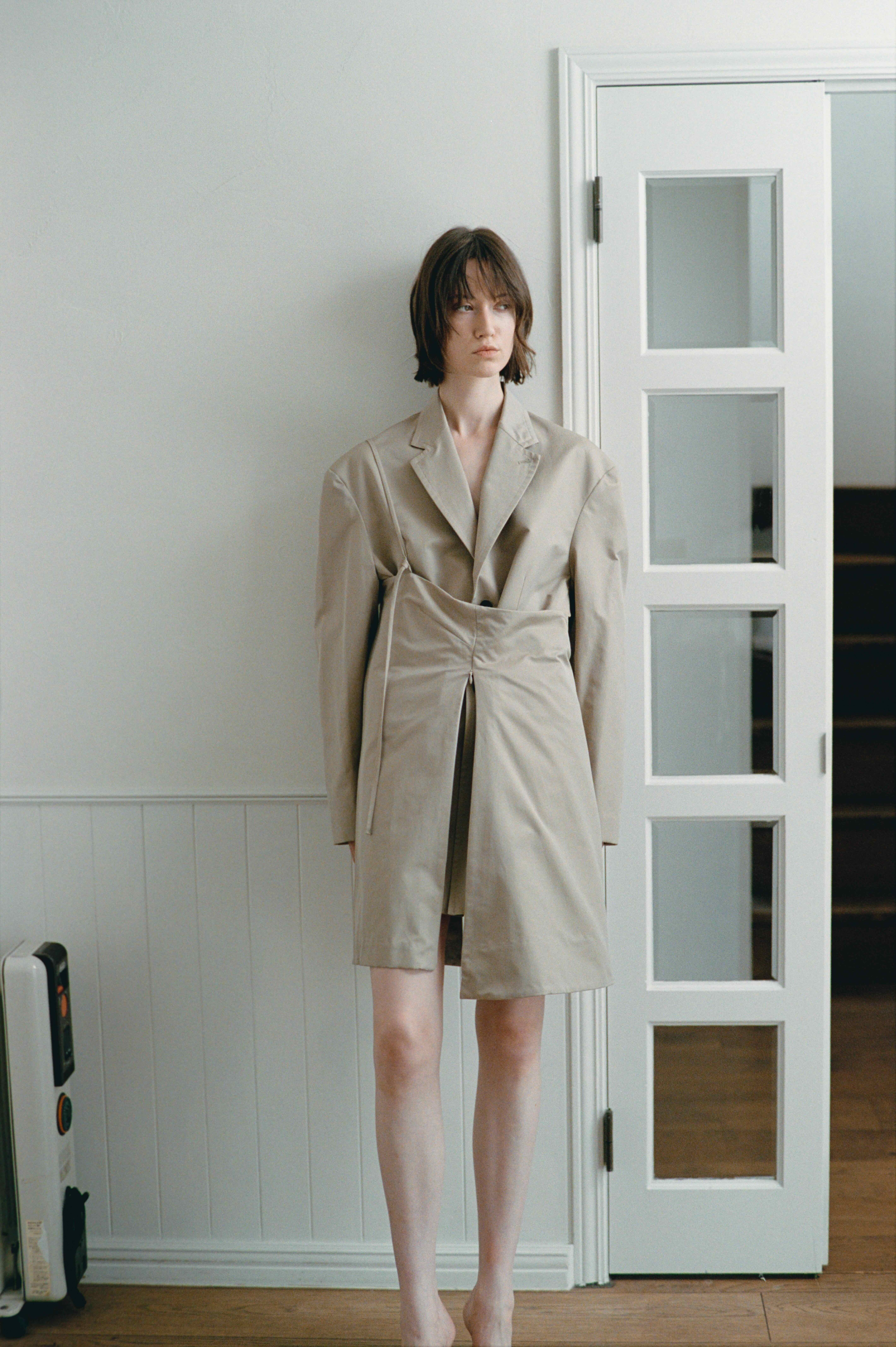 縦糸にポリエステル、緯糸にコットンの交織にて織り上げたツイル素材。ポリエステルとコットンを染め分けることで、先染めのようなシャンブレーの表情が生まれ、奥行きのある色合いが特徴。潔いオーバサイズ。襟を立てて着ることも可能。薄い肩パッドを内蔵しており、着用時に美しいシルエットが保たれます。撥水加工が施されており、実用性を兼ね備えています。