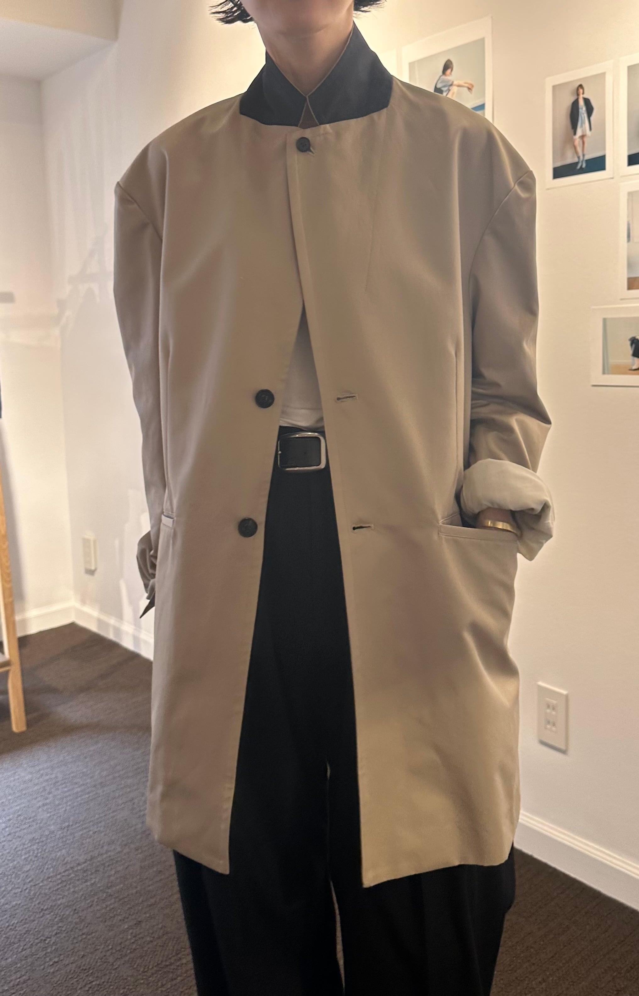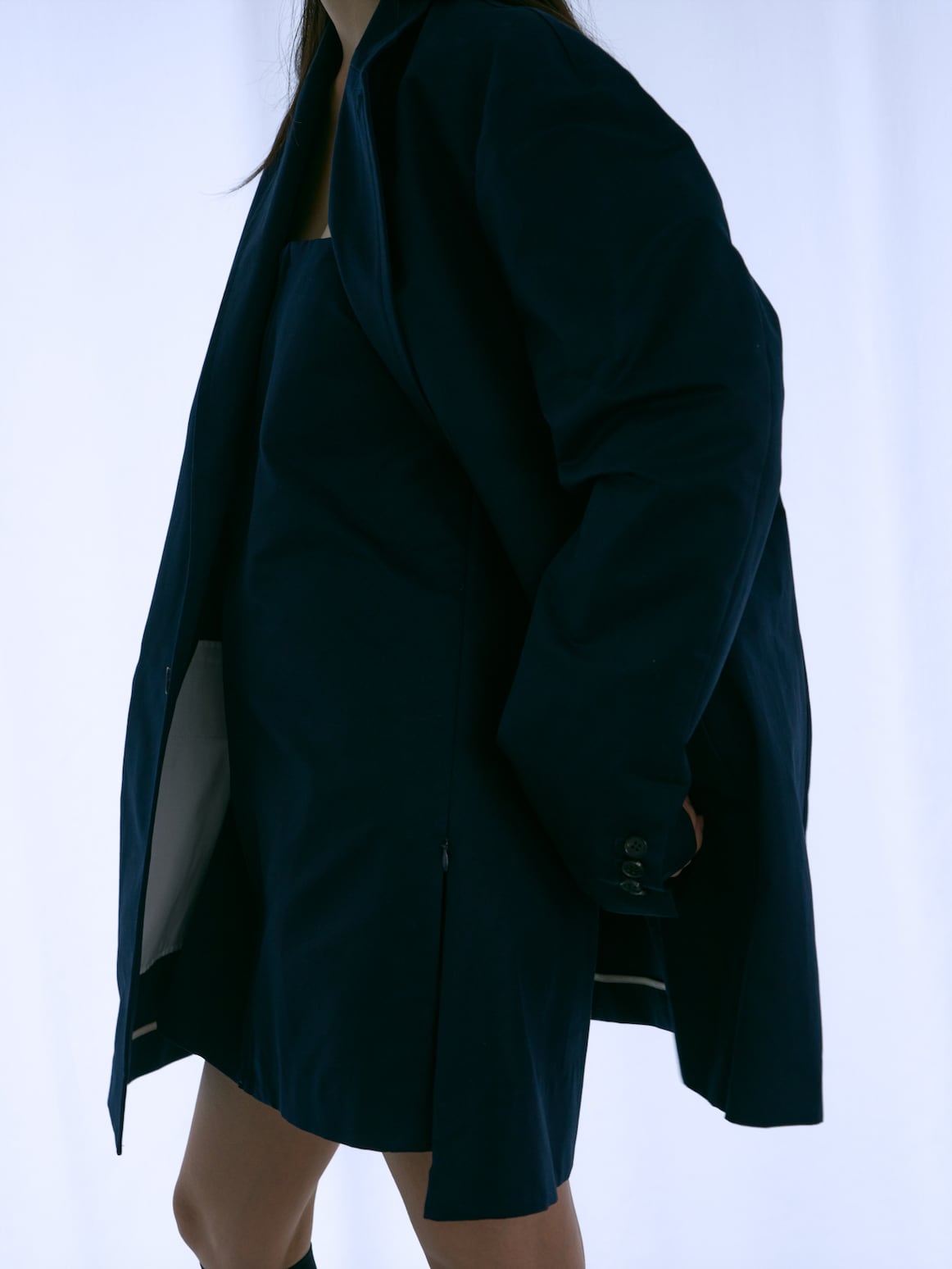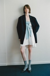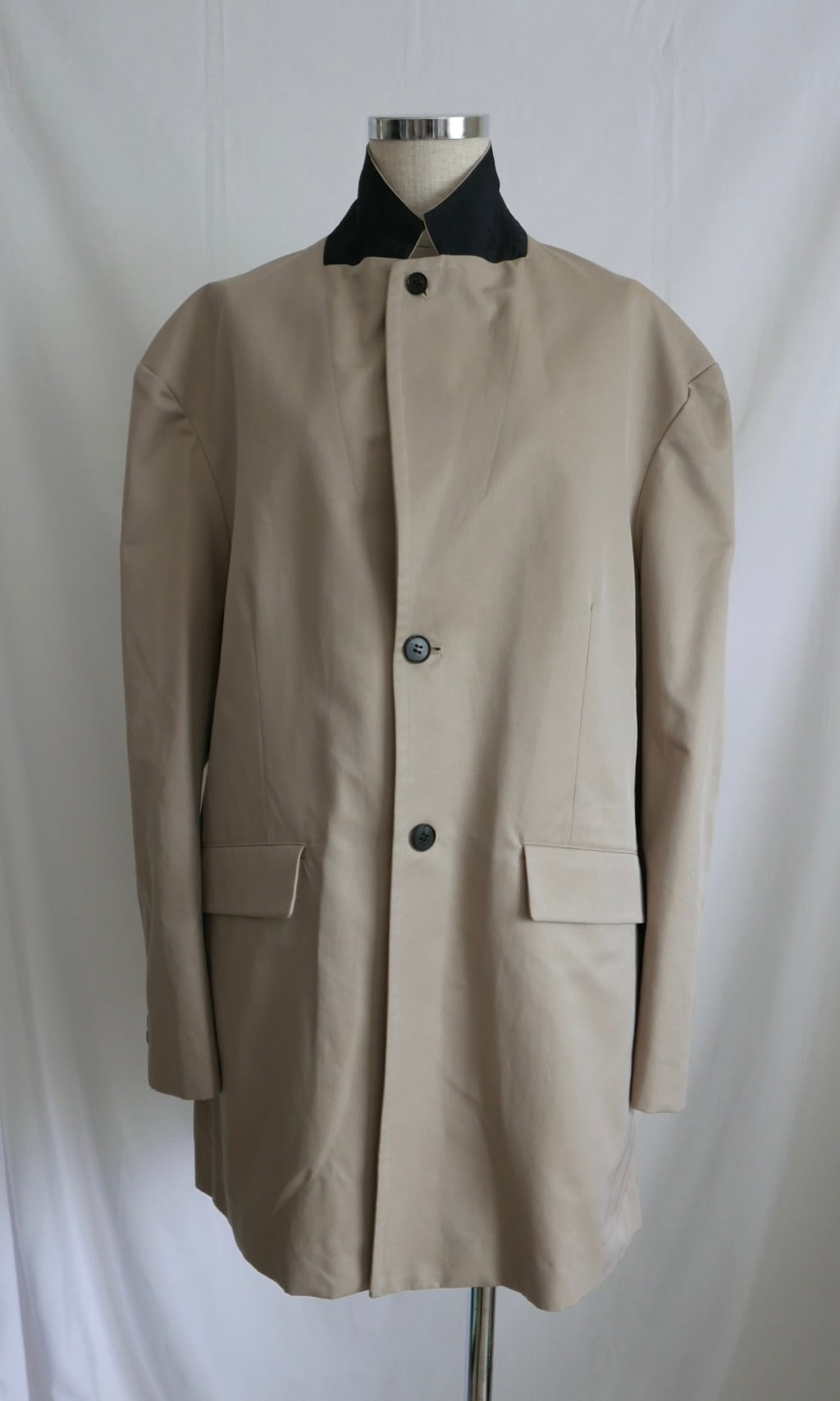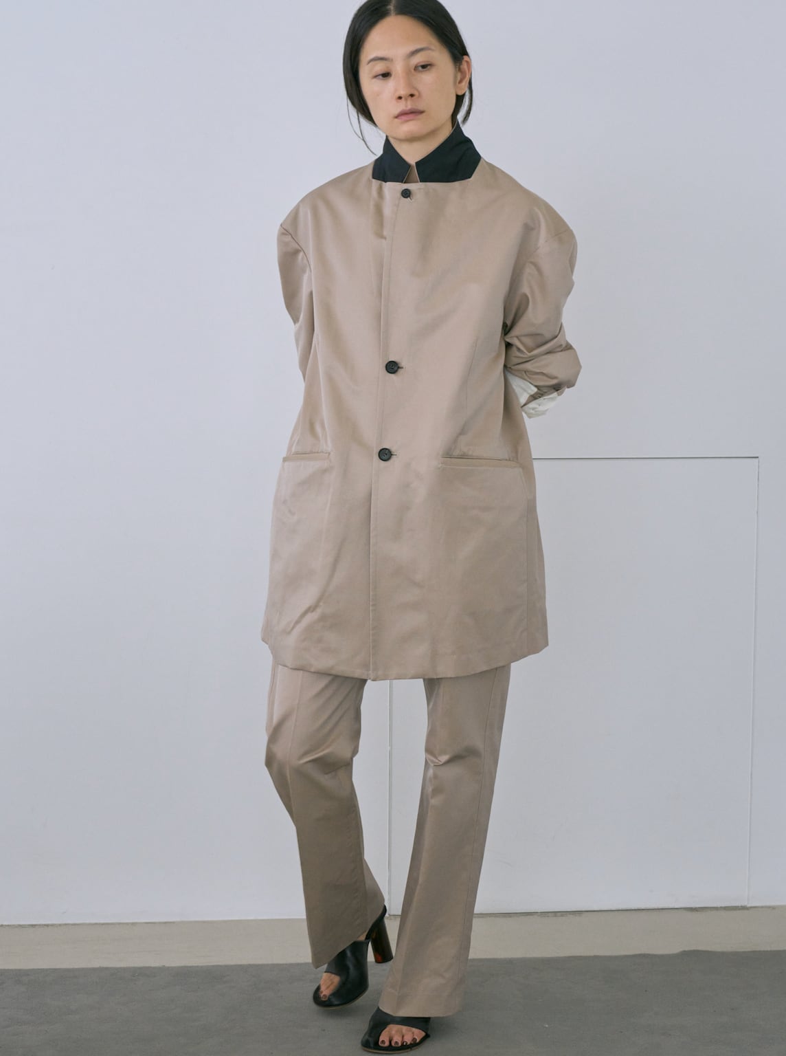 縦糸にポリエステル、緯糸にコットンの交織にて織り上げたツイル素材。ポリエステルとコットンを染め分けることで、先染めのようなシャンブレーの表情が生まれ、奥行きのある色合いが特徴。潔いオーバサイズ。襟を立てて着ることも可能。薄い肩パッドを内蔵しており、着用時に美しいシルエットが保たれます。撥水加工が施されており、実用性を兼ね備えています。