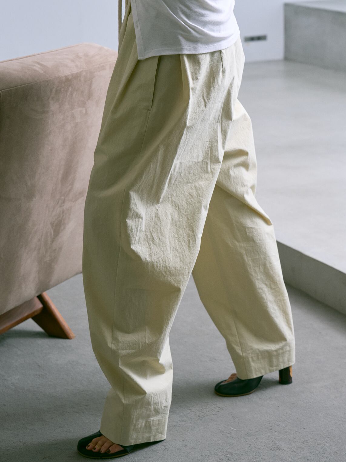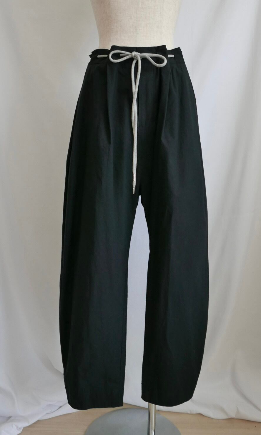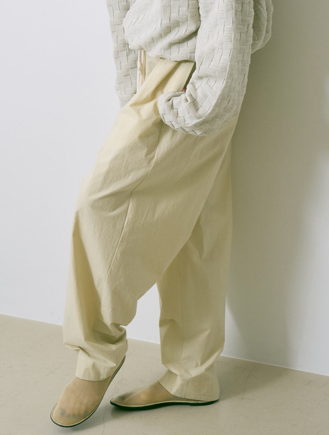 高密度に織り上げたブロード生地に近江晒加工を施し、自然なシボ感を出しています。樹脂で仕上げるワッシャー加工により、独特の風合いも楽しめます。カービーシルエット。大きめのウエスト設定にしており、ドローストリング仕様で調整して着用できます。