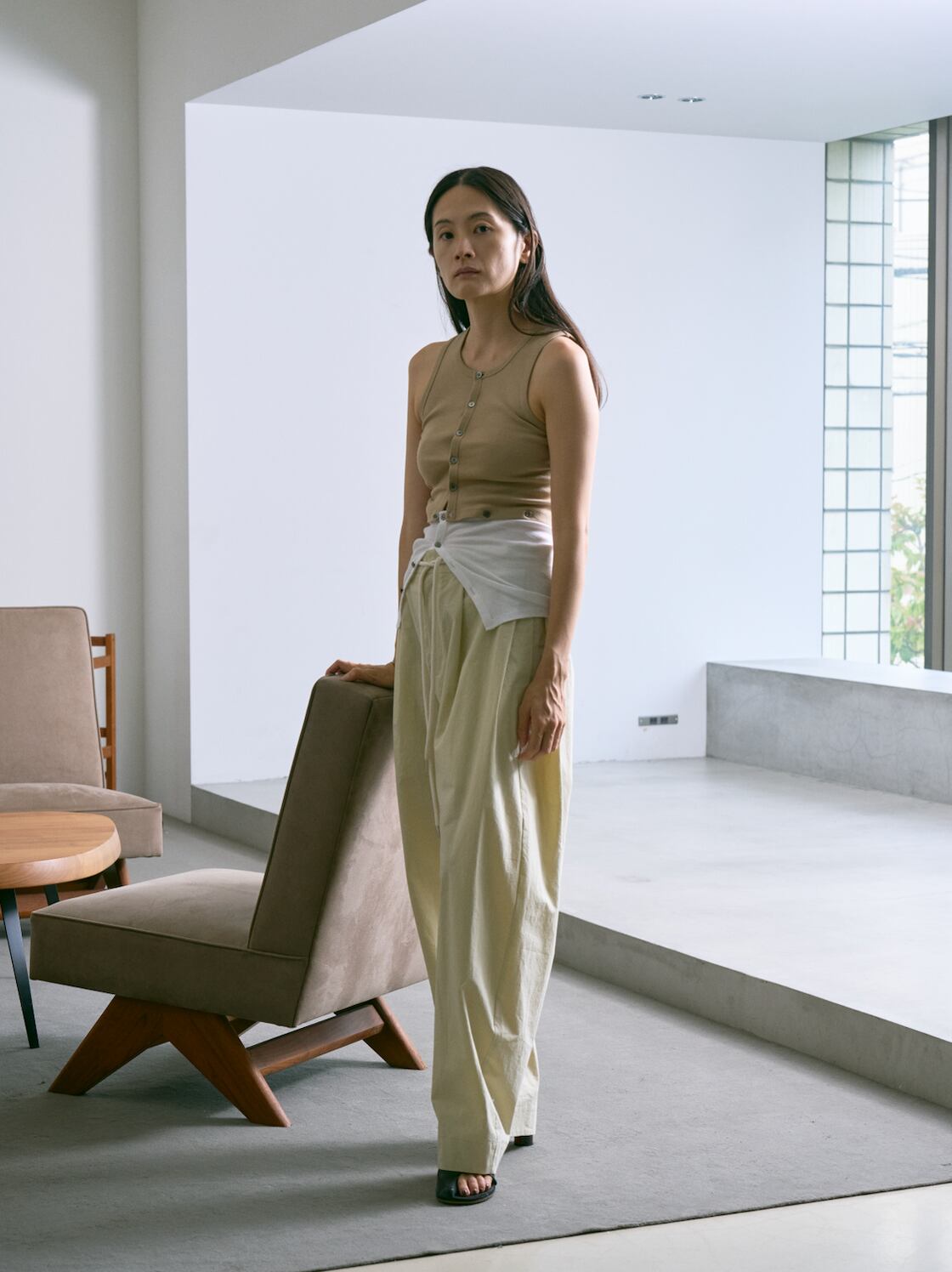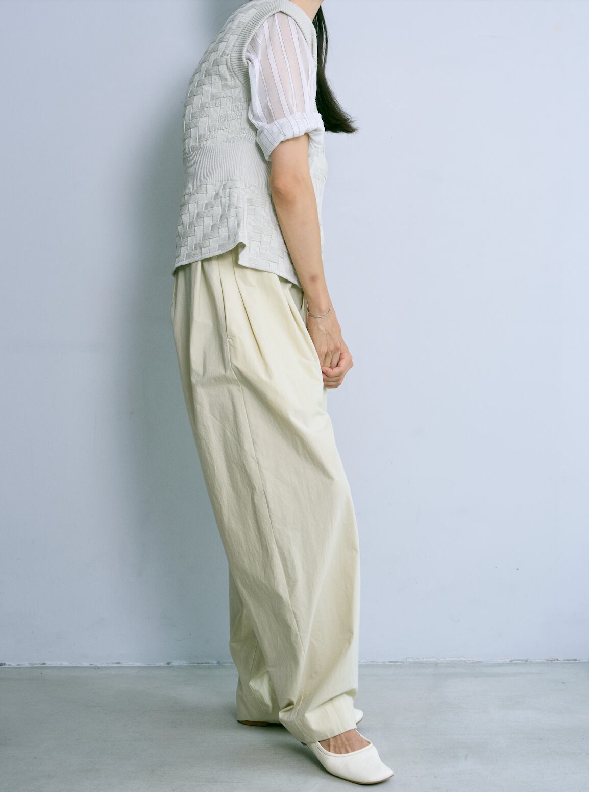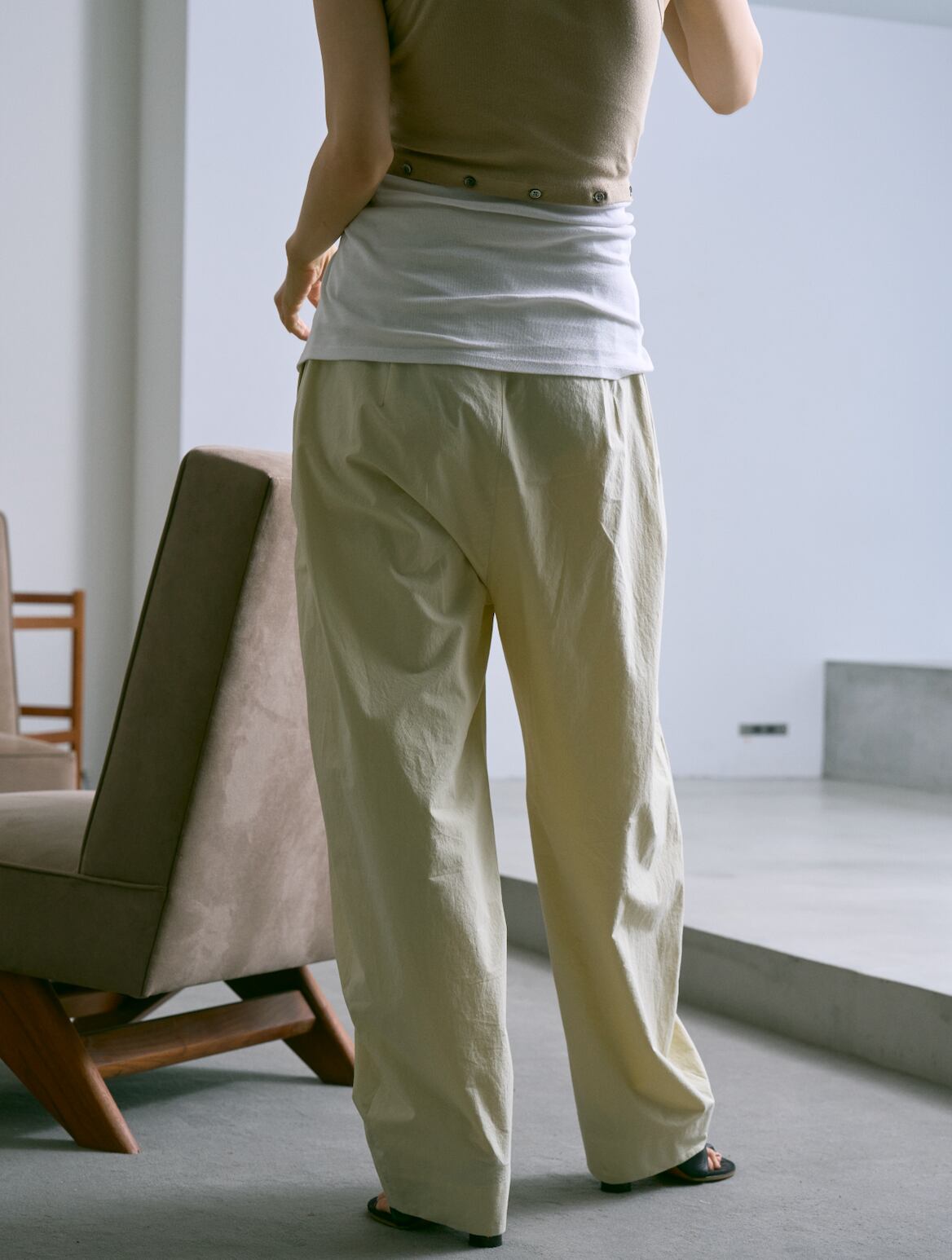 高密度に織り上げたブロード生地に近江晒加工を施し、自然なシボ感を出しています。樹脂で仕上げるワッシャー加工により、独特の風合いも楽しめます。カービーシルエット。大きめのウエスト設定にしており、ドローストリング仕様で調整して着用できます。