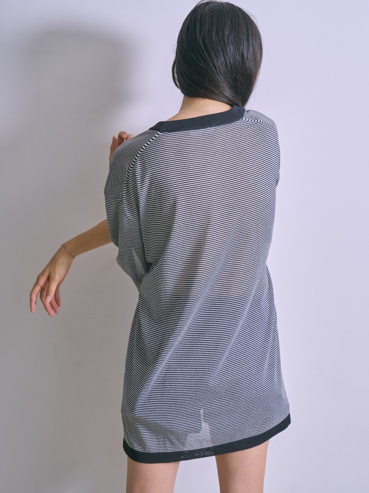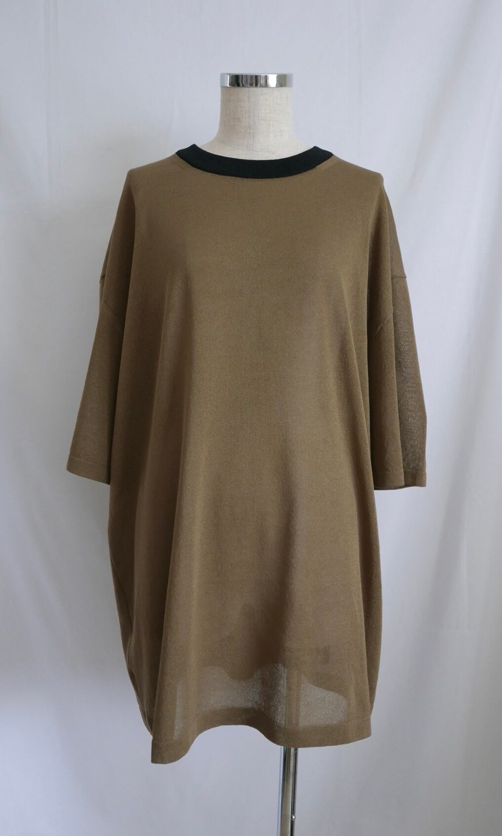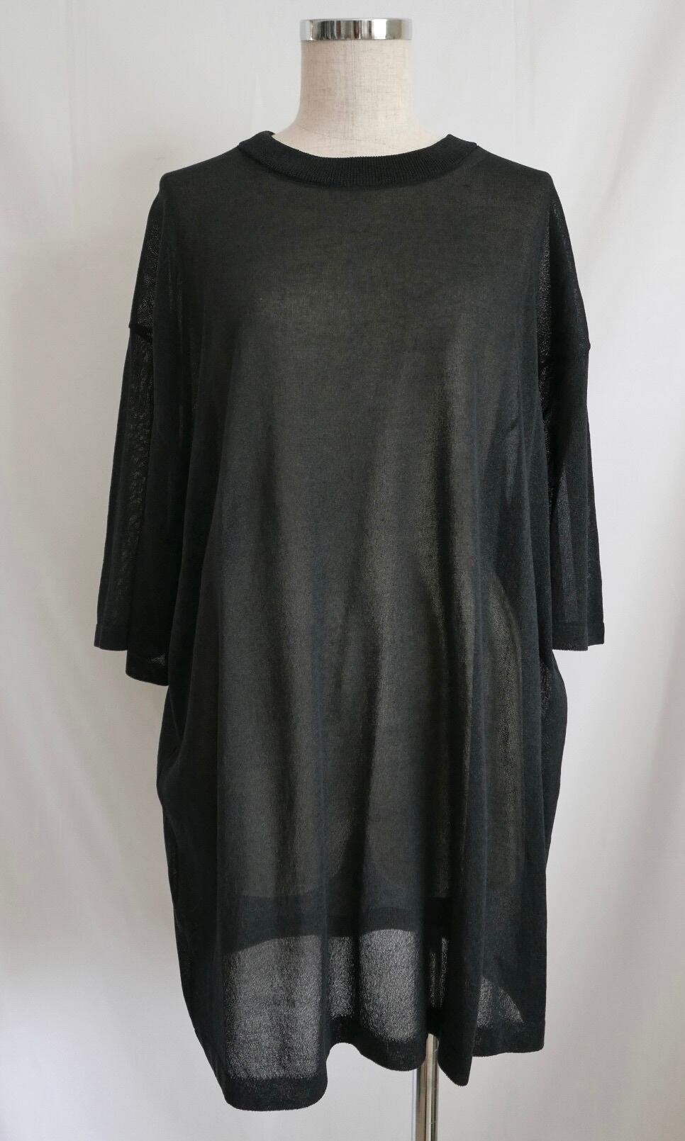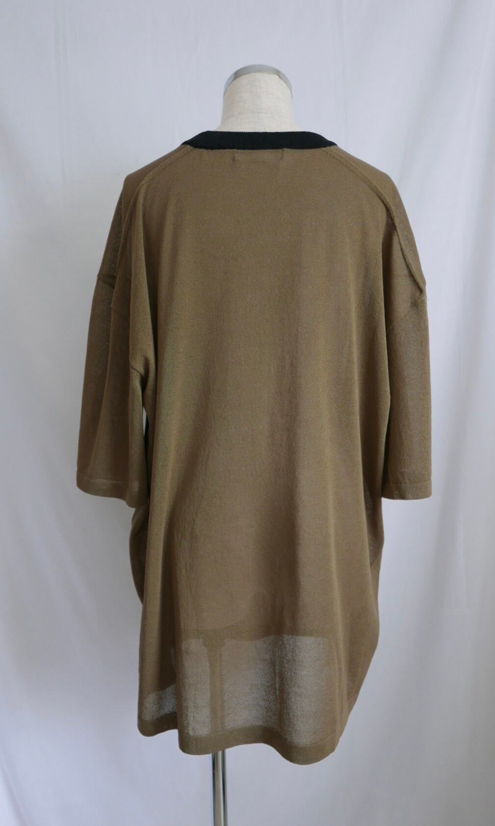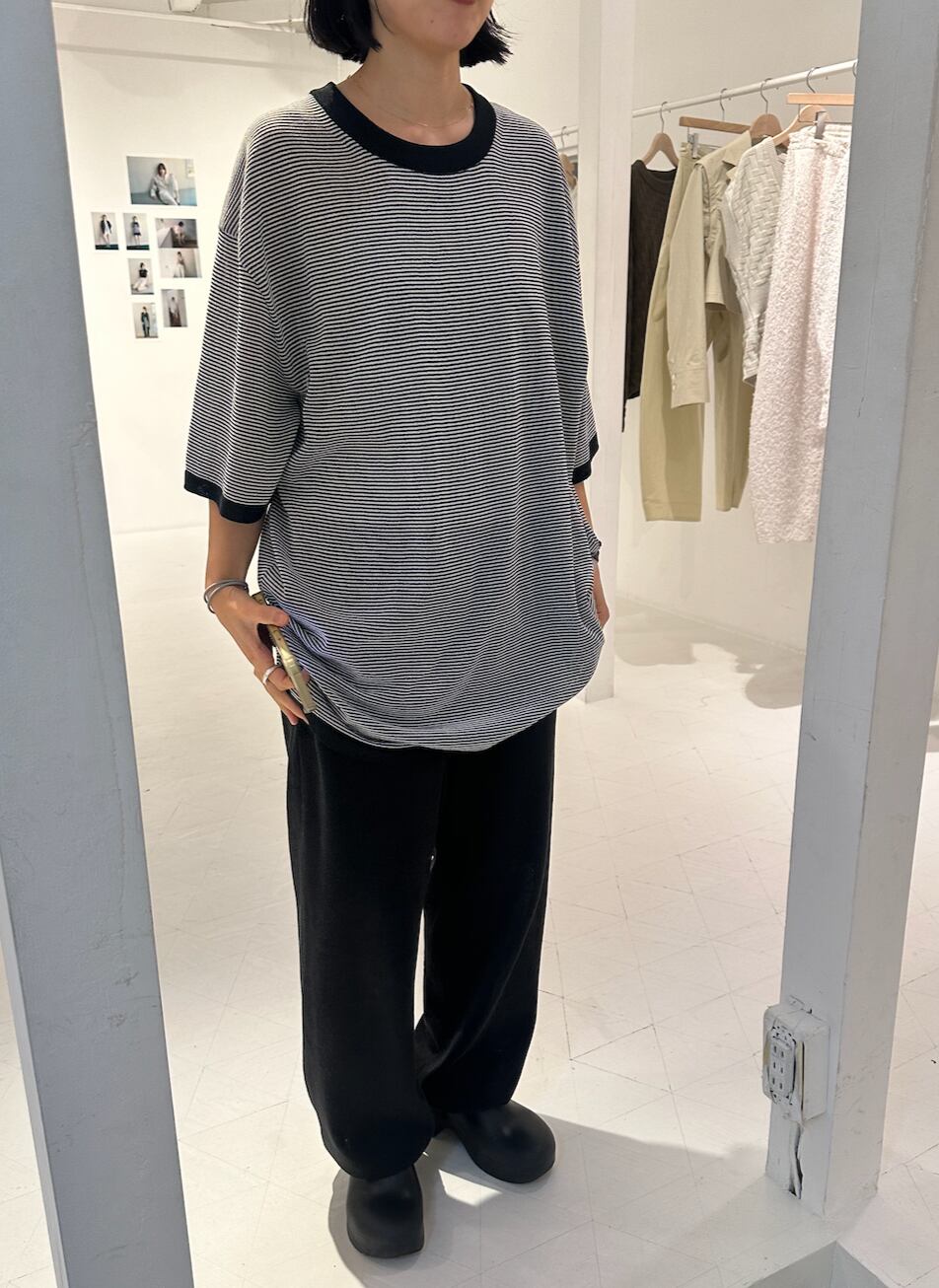 和紙を撚りこんだ糸を使用。繊維に適度な隙間があるため吸水速乾性に優れています。麻のようなシャリ感。家庭での洗濯も可能。軽く編み立てた天竺の編み地。オーバサイズ。程よい透け感があります。