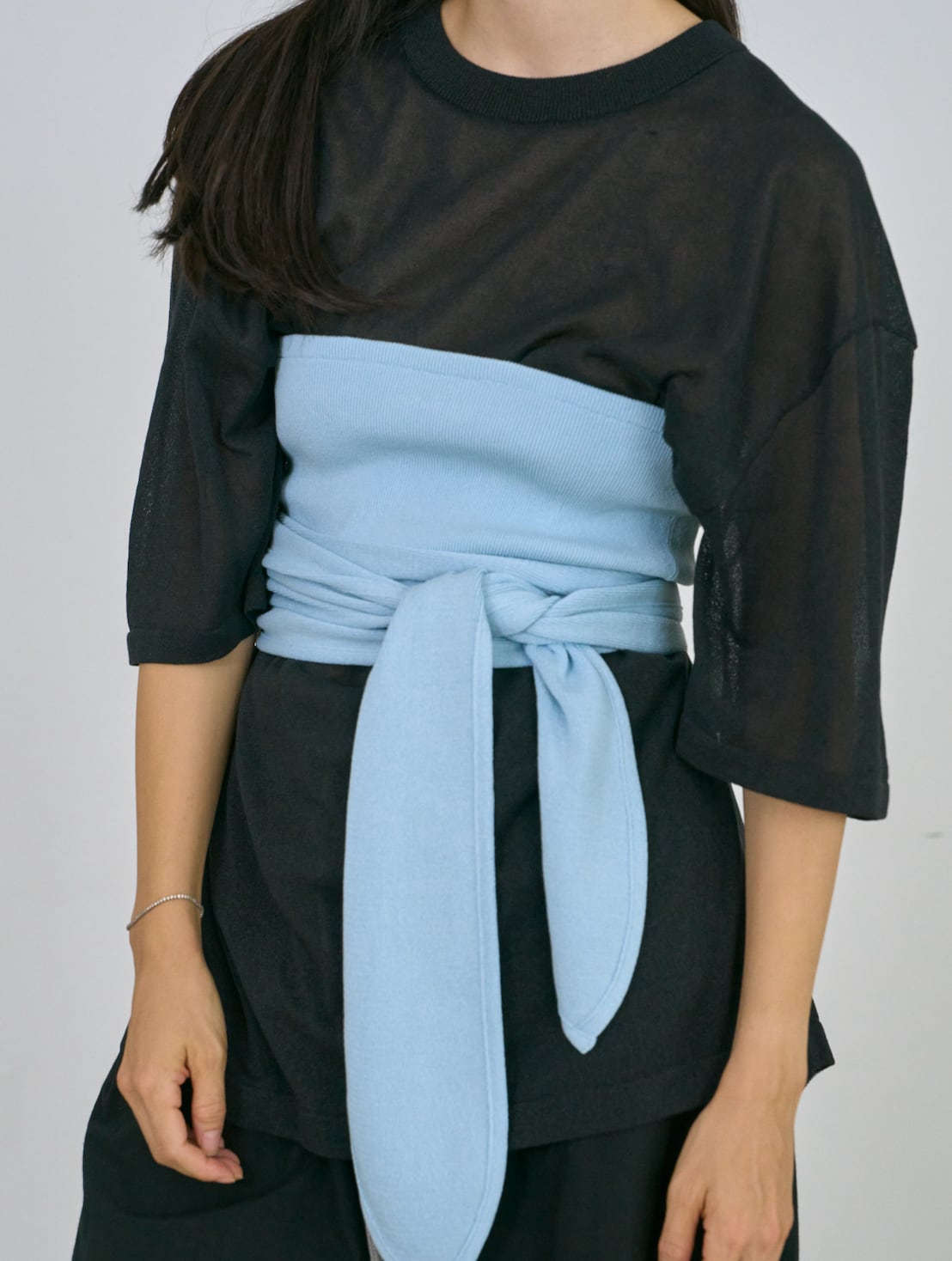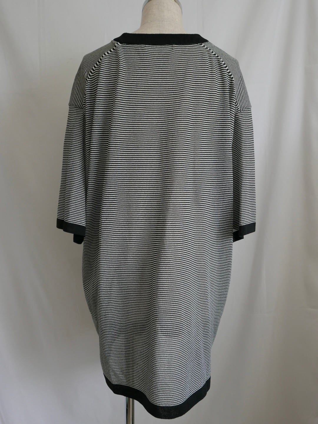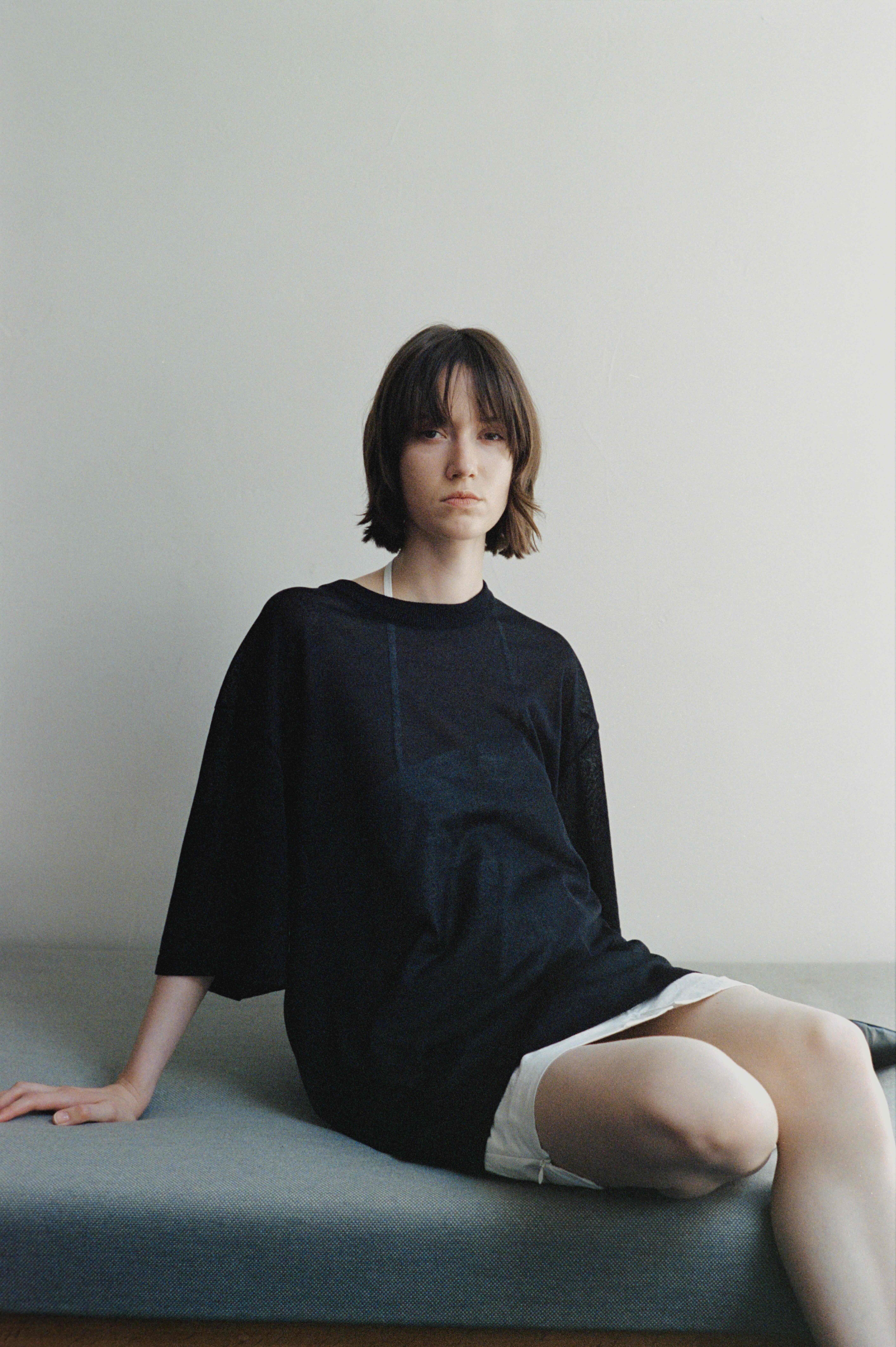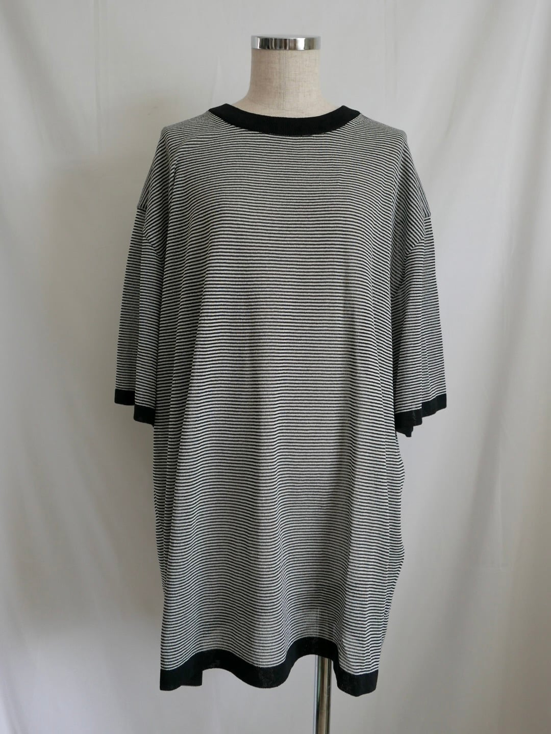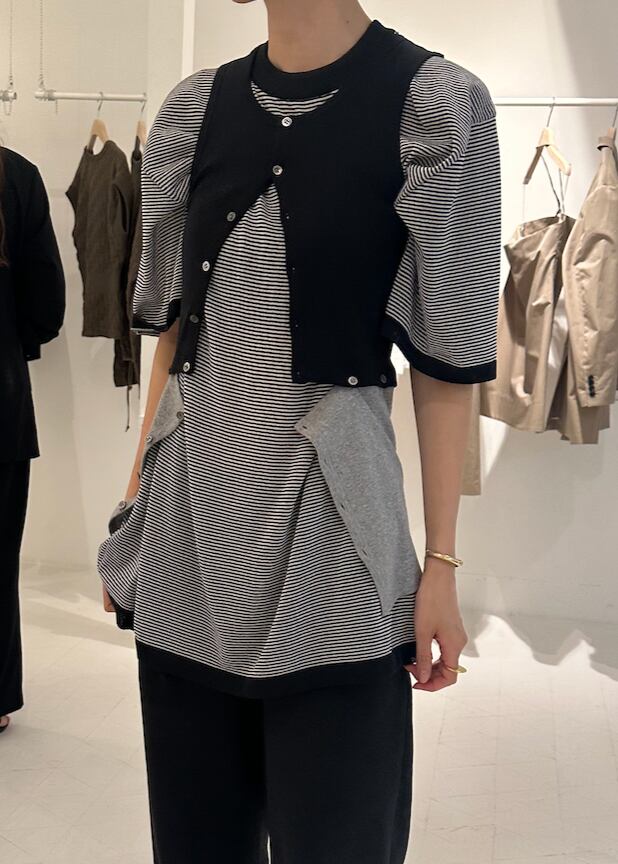 和紙を撚りこんだ糸を使用。繊維に適度な隙間があるため吸水速乾性に優れています。麻のようなシャリ感。家庭での洗濯も可能。軽く編み立てた天竺の編み地。オーバサイズ。程よい透け感があります。