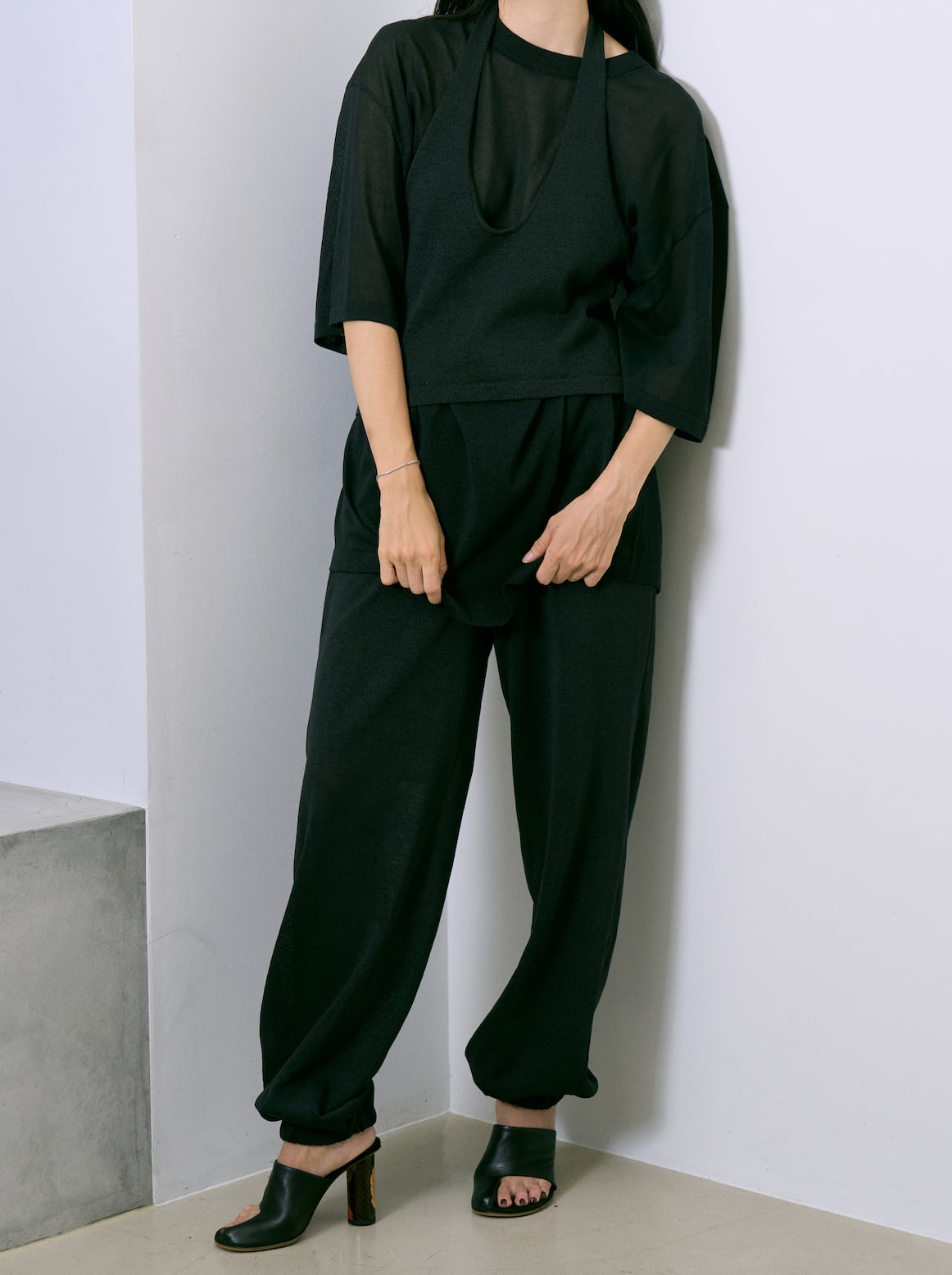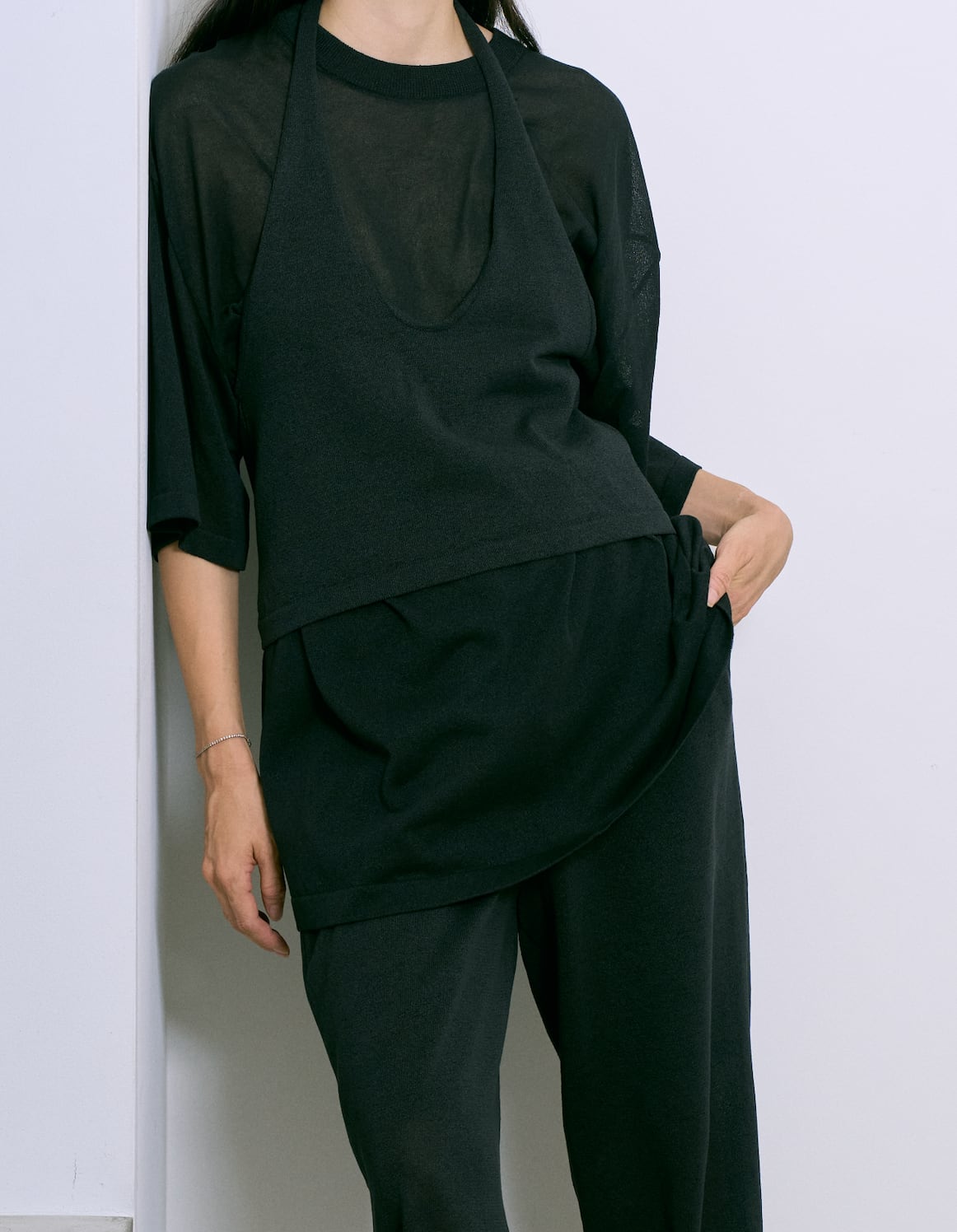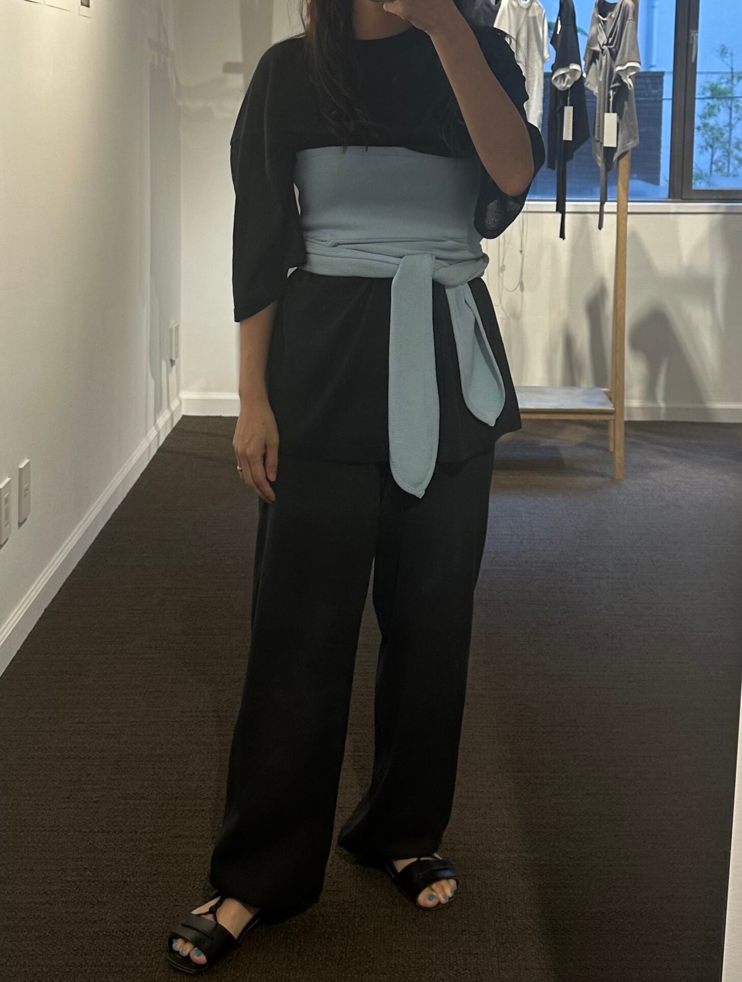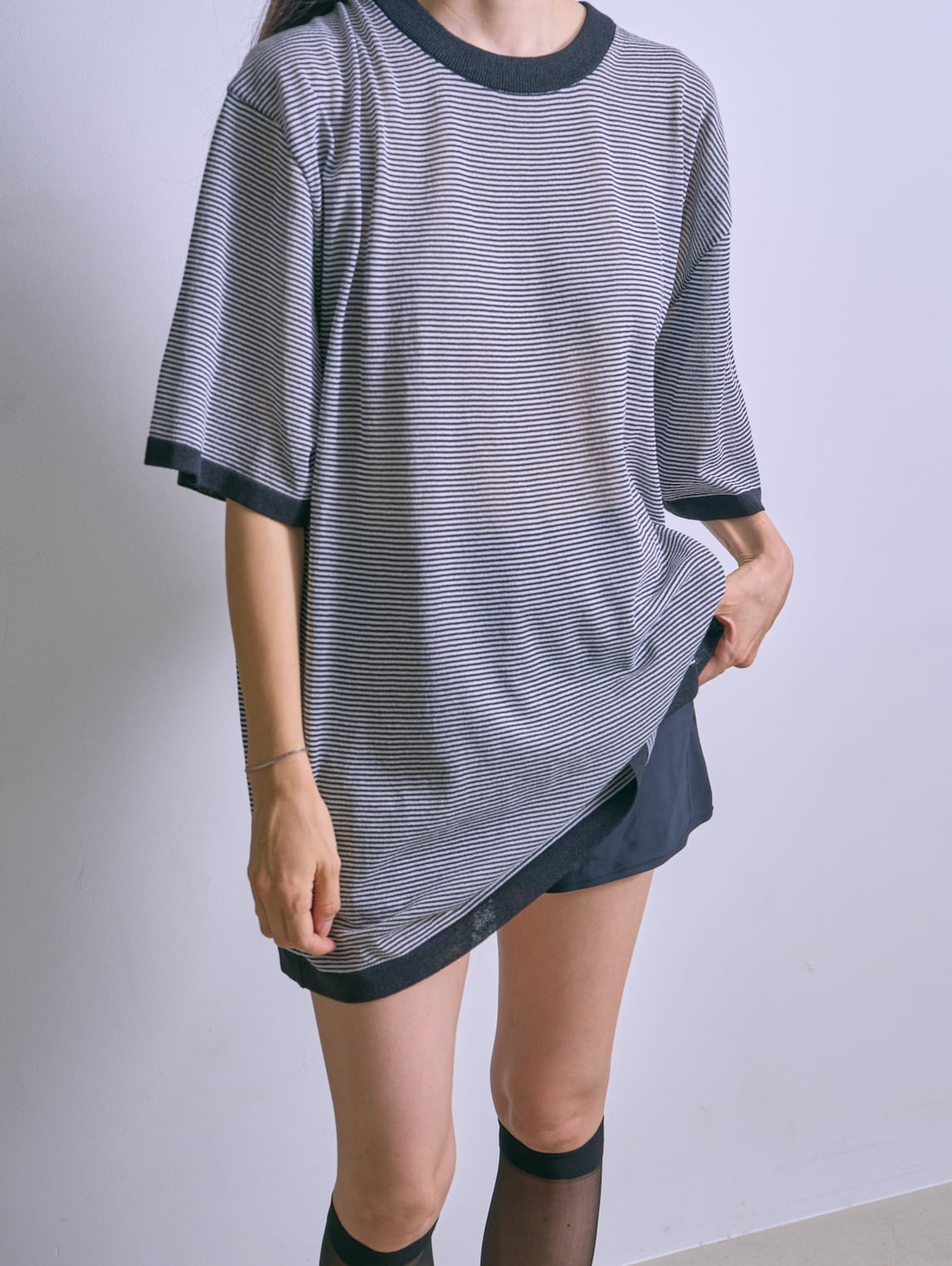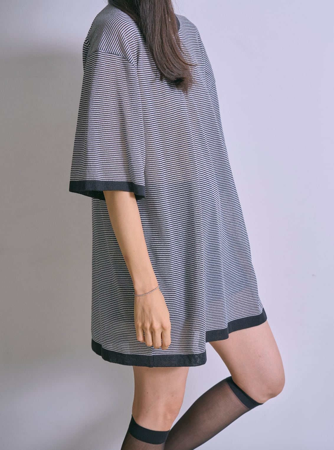 和紙を撚りこんだ糸を使用。繊維に適度な隙間があるため吸水速乾性に優れています。麻のようなシャリ感。家庭での洗濯も可能。軽く編み立てた天竺の編み地。オーバサイズ。程よい透け感があります。