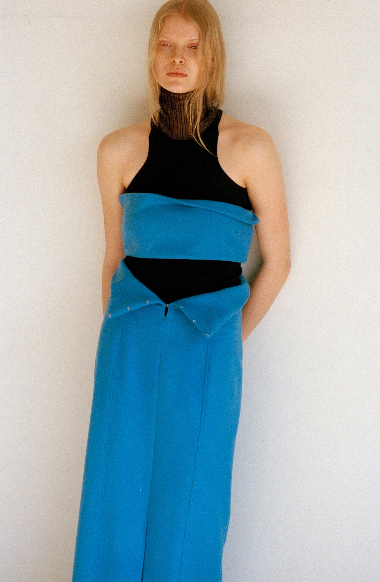 世界三大毛織物産地である尾州にて生産。カシミヤ混のスーパー120s原料をふんだんに使用し、仕上げにビーバー起毛加工を施した素材。上質な原料ならではの光沢感となめらかな肌触りが特徴。上端を折り曲げて着用も可能。